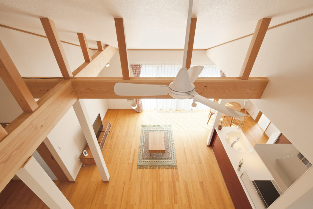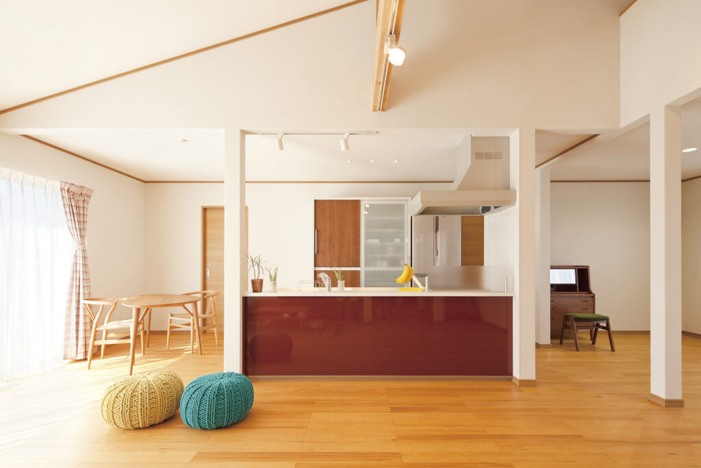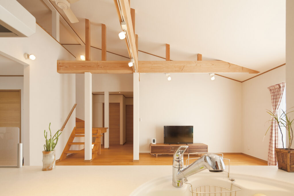 平屋とは思えないほどの高い天井と広い空間が広がるLDK。